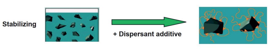 The polar heads will form hydrogen bonding interactions between different pigment units resulting in a network that enhances the separation of the particles (controlled flocculation). Inorganic pigments are usually metal oxides which contain positive metal ions and negative oxide ions. These ions are good anchoring points on which the anchoring groups of the dispersion control additive can attach to (polar interactions).